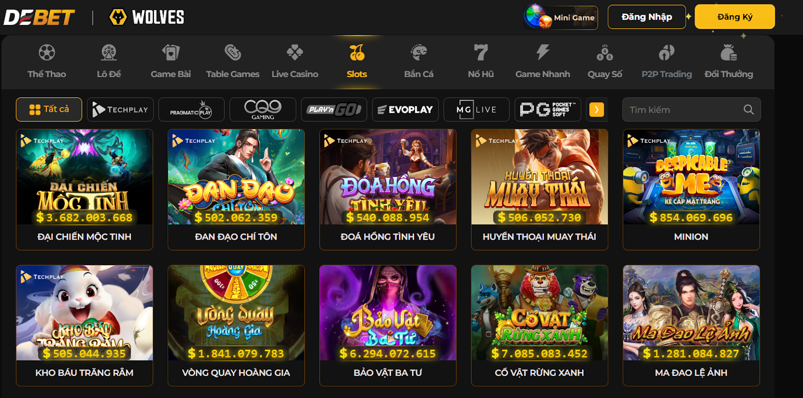Hệ thống game slot với đa dạng các trò chơi độc đáo được cập nhập liên tục, đồ họa và nội dung game cực lôi cuốn giúp anh em có được giây phút cá cược bùng nổ. Mỗi một sản phẩm game slot của Debet đều mang một màu sắc riêng biệt không thể lẫn với một nhà cái nào khác.