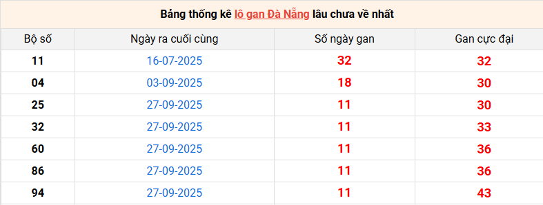 Bảng thống kê lô gan Đà Nẵng lâu về nhất 08/112025