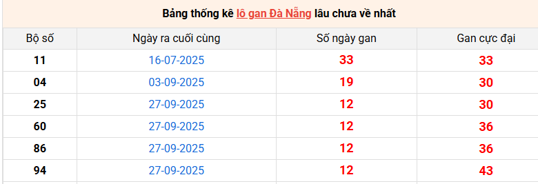Bảng thống kê lô gan Đà Nẵng 12/11/2025
