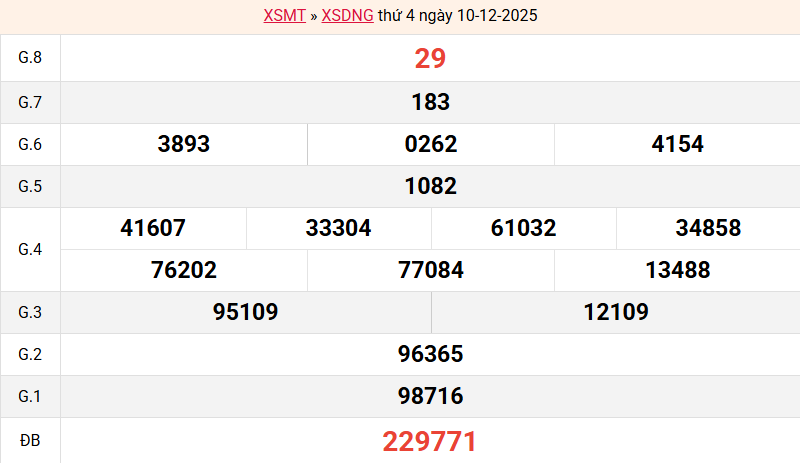 Bảng kết quả Đà Nẵng ngày 10/12/2025 tuần trước