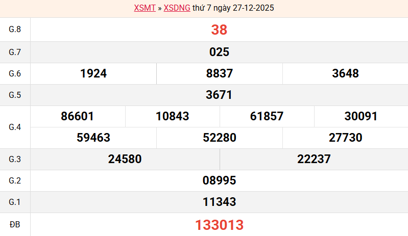 Mời các bạn xem lại bảng kết quả kỳ trước với giải đặc biệt, giải tám, lô tô 2 số để có thể đưa ra nhận định dự đoán DNG ngày 31/12 năm 2025 chuẩn xác nhất.