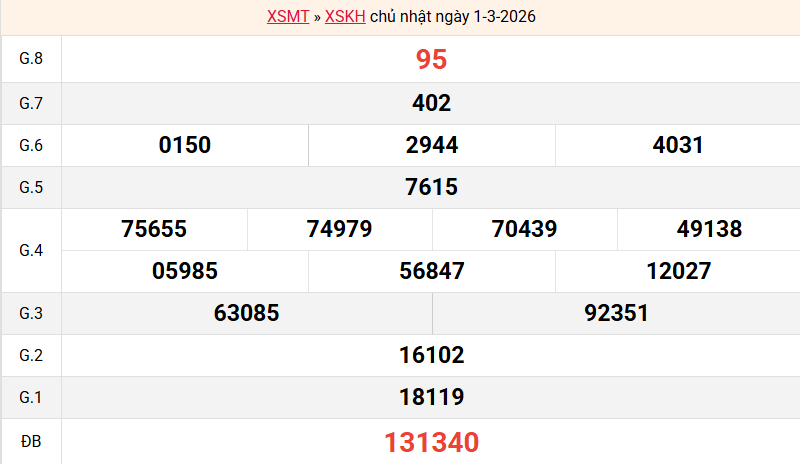 Mời các bạn xem lại bảng kết quả kỳ trước với giải đặc biệt, giải tám, lô tô 2 số để có thể đưa ra nhận định dự đoán KH ngày 04/03/2026 chuẩn xác nhất.