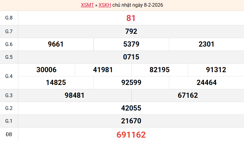 Mời các bạn xem lại bảng kết quả kỳ trước với giải đặc biệt, giải tám, lô tô 2 số để có thể đưa ra nhận định dự đoán KH ngày 11/02/2026 chuẩn xác nhất.