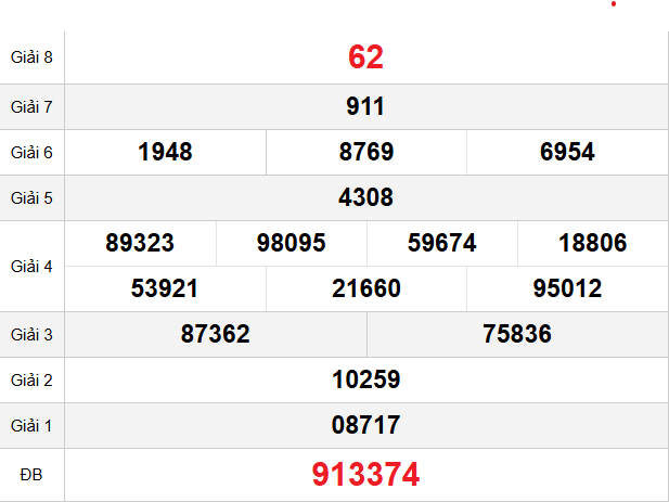 Mời các bạn xem lại bảng kết quả kỳ trước với giải đặc biệt, giải tám, lô tô 2 số để có thể đưa ra nhận định dự đoán KH ngày 19/10 năm 2025 chuẩn xác nhất.