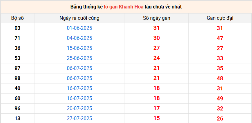 Bảng lô gan Khánh Hòa lâu về nhất 21/9/2025