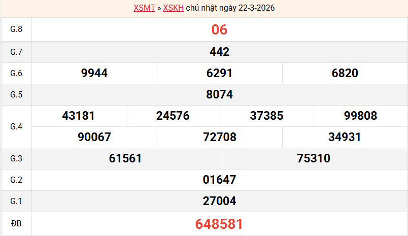 Mời các bạn xem lại bảng kết quả kỳ trước với giải đặc biệt, giải tám, lô tô 2 số để có thể đưa ra nhận định dự đoán KH ngày 25/03/2026 chuẩn xác nhất.