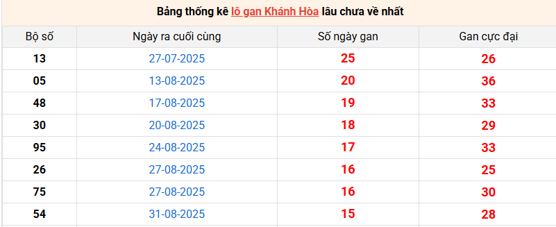 Bảng lô gan Khánh Hòa lâu về nhất 26/10/2025