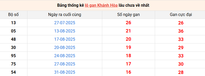 Bảng thống kê lô gan XSKH lâu về nhất 29/10/2025