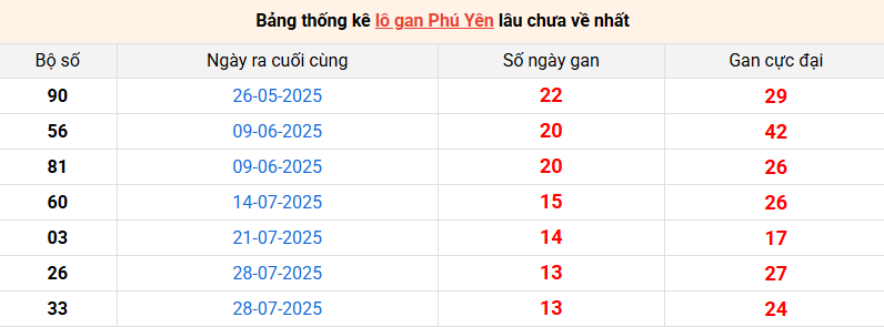 Bảng thống kê lô gan Phú Yên lâu về nhất 03/11/2025