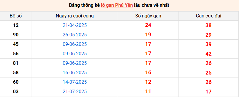 Bảng thống kê lô gan Phú Yên lâu về nhất 13/10/2025