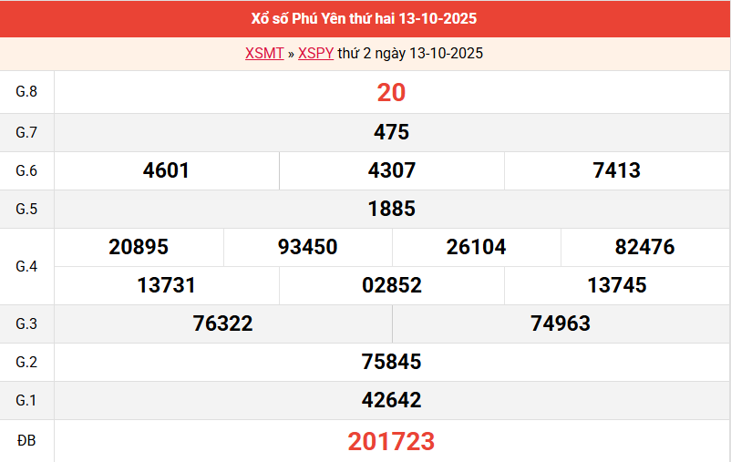 Bảng kết quả Phú Yên ngày 13/10/2025 tuần trước