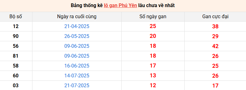 Bảng thống kê lô gan Phú Yên lâu về nhất 20/10/2025
