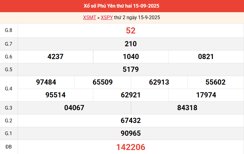 Bảng kết quả Phú Yên ngày 15/9/2025 tuần trước