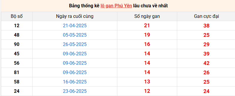 Bảng thống kê lô gan Phú Yên lâu về nhất 22/9/2025