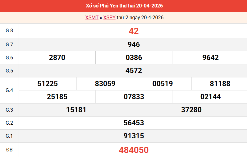 Bảng kết quả Phú Yên ngày 20/04/2026 hôm trước