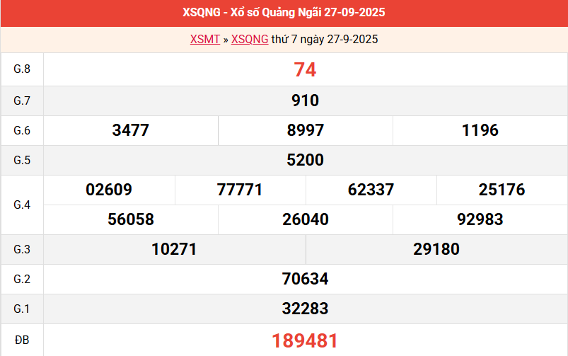 Bảng kết quả Quảng Ngãi ngày 27/9/2025 tuần trước