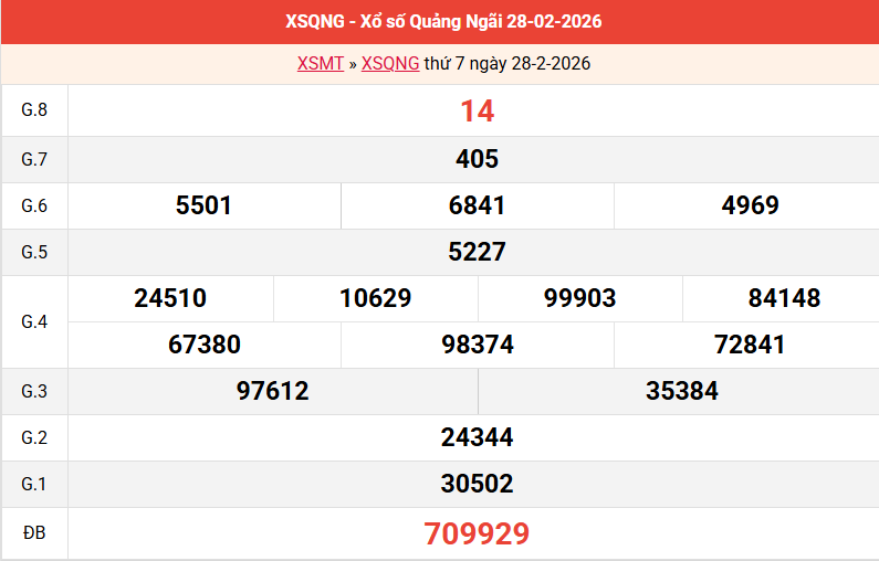 Bảng kết quả Quảng Ngãi ngày 28/02/2026 tuần trước