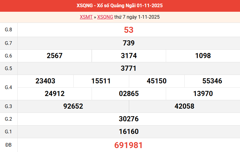 Bảng kết quả Quảng Ngãi ngày 01/11/2025 tuần trước
