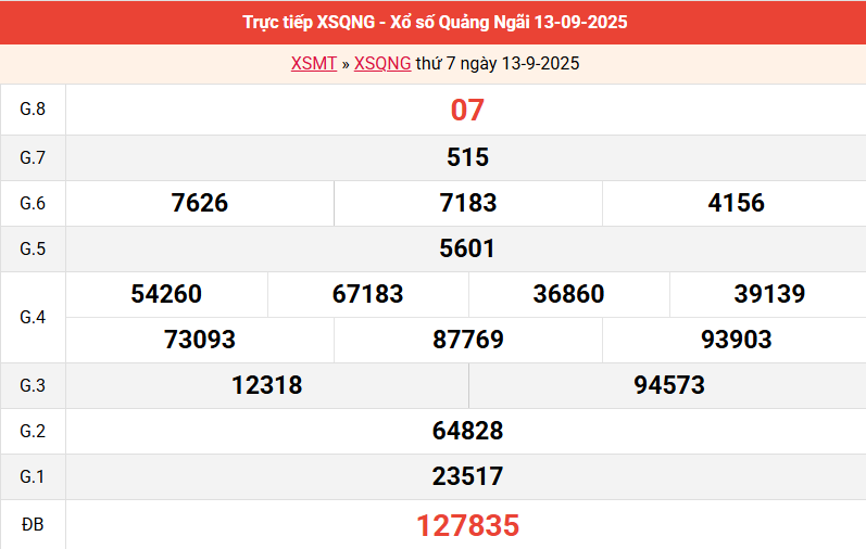 Bảng kết quả Quảng Ngãi ngày 13/9/2025 tuần trước