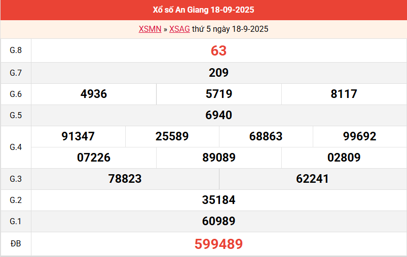 Mời các bạn xem lại bảng kết quả kỳ trước với giải đặc biệt, giải tám, lô tô 2 số để có thể đưa ra nhận định dự đoán AG ngày 25/9 năm 2025 chuẩn xác nhất.