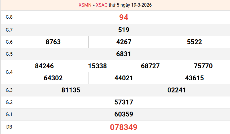 Mời các bạn xem lại bảng kết quả kỳ trước với giải đặc biệt, giải tám, lô tô 2 số để có thể đưa ra nhận định dự đoán AG ngày 26/03/2026 chuẩn xác nhất.