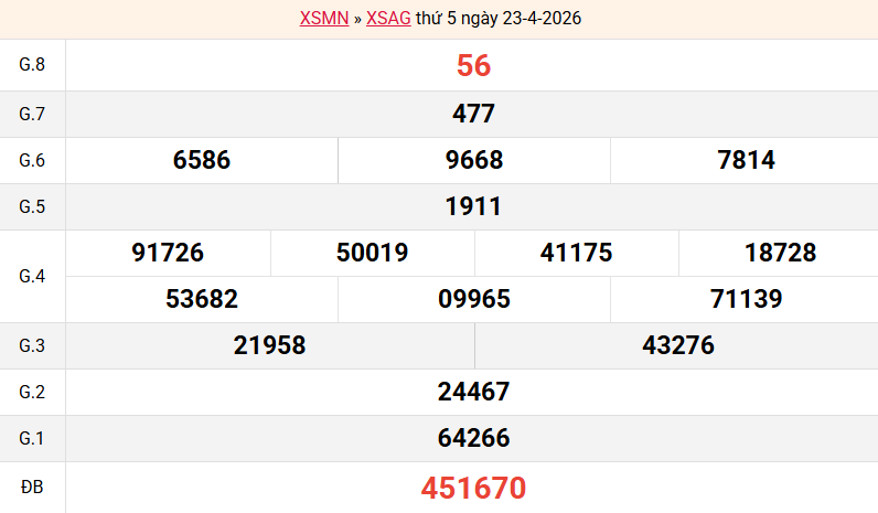 Mời các bạn xem lại bảng kết quả kỳ trước với giải đặc biệt, giải tám, lô tô 2 số để có thể đưa ra nhận định dự đoán AG ngày 30/04/2026 chuẩn xác nhất.