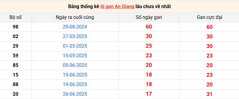 Bảng thống kê lô gan An Giang lâu về nhất 30/10/2025