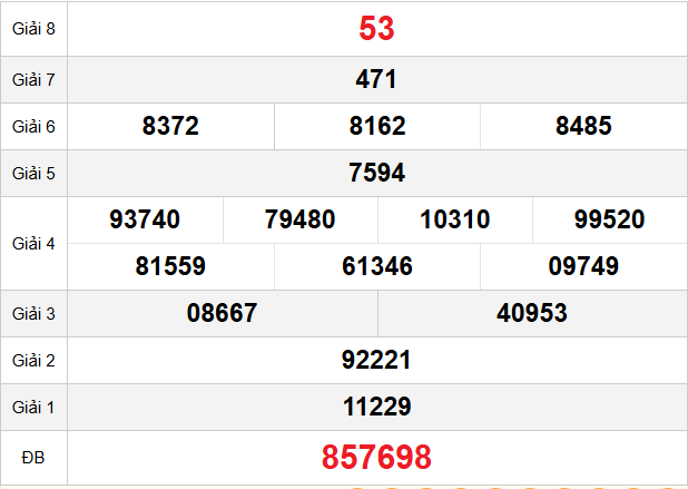 Mời các bạn xem lại bảng kết quả kỳ trước với giải đặc biệt, giải tám, lô tô 2 số để có thể đưa ra nhận định dự đoán BD ngày 07/11 năm 2025 chuẩn xác nhất.