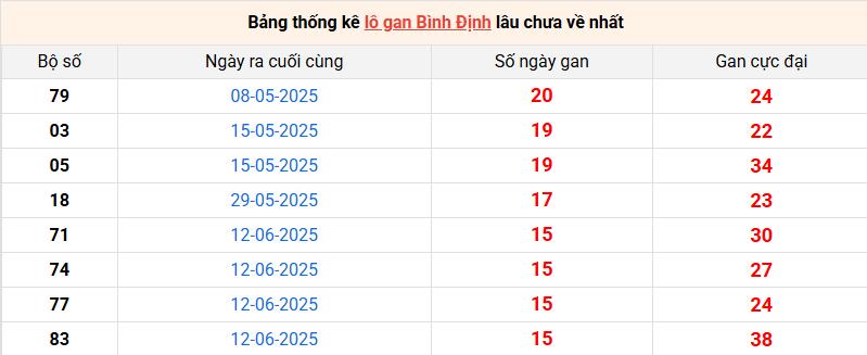 Bảng thống kê lô gan Bình Định lâu về nhất 02/10/2025