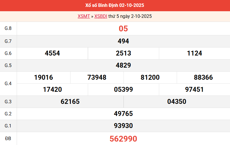 Bảng kết quả Bình Định ngày 02/10/2025 tuần trước