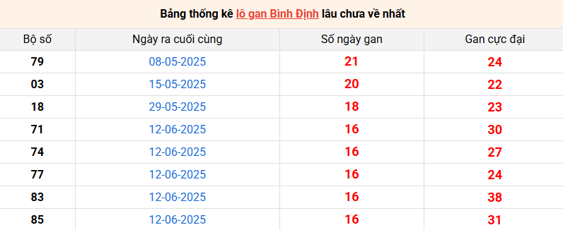 Bảng thống kê lô gan Bình Định lâu về nhất 09/10/2025