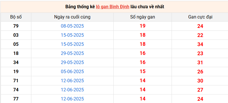 Bảng thống kê lô gan Bình Định lâu về nhất 25/9/2025