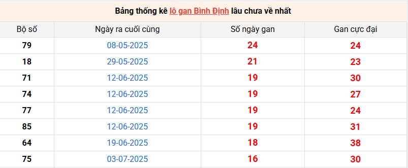 Bảng thống kê lô gan Bình Định lâu về nhất 30/10/2025