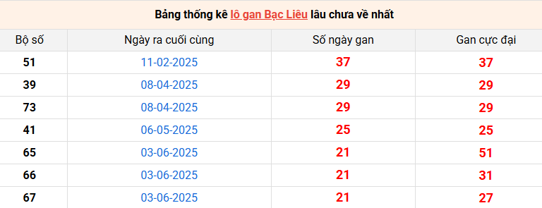 Bảng thống kê lô gan Bạc Liêu lâu về nhất 04/11/2025