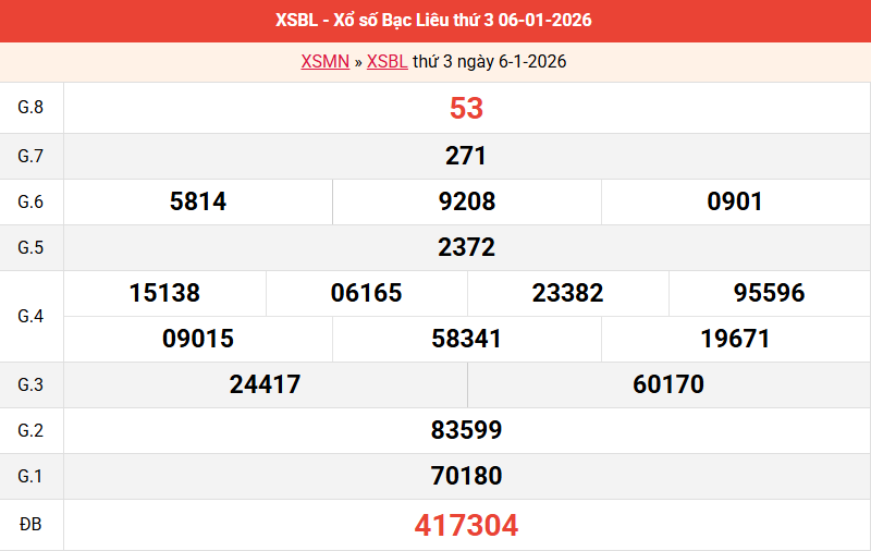 Bảng kết quả Bạc Liêu ngày 06/01/2026 tuần trước