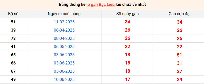 Bảng thống kê lô gan Bạc Liêu lâu về nhất 14/10/2025