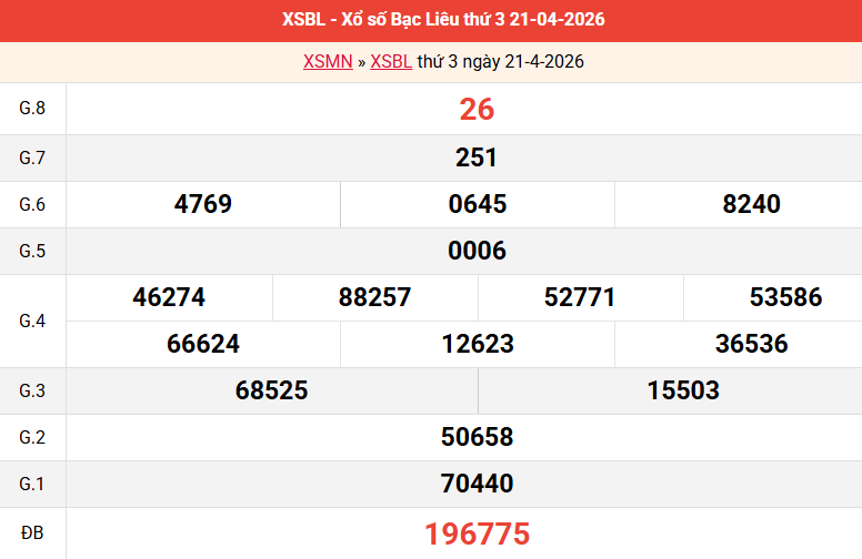 Bảng kết quả Bạc Liêu ngày 21/04/2026 tuần trước