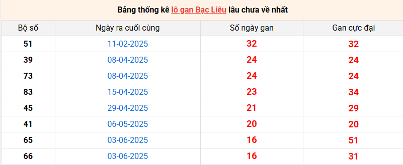 Bảng thống kê lô gan Bạc Liêu lâu về nhất 30/9/2025
