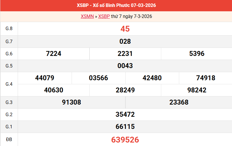 Bảng kết quả Bình Phước ngày 07/03/2026 tuần trước