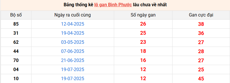 Bảng thống kê lô gan Bình Phước lâu về nhất 18/10/2025