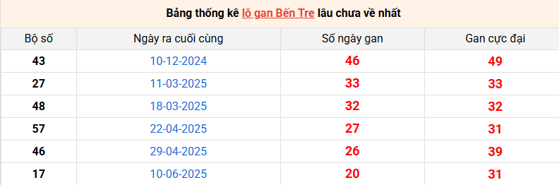 Bảng thống kê lô gan Bến Tre lâu về nhất 04/11/2025