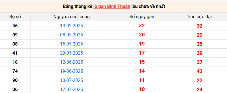 Bảng thống kê lô gan Bình Thuận lâu về nhất 02/10/2025