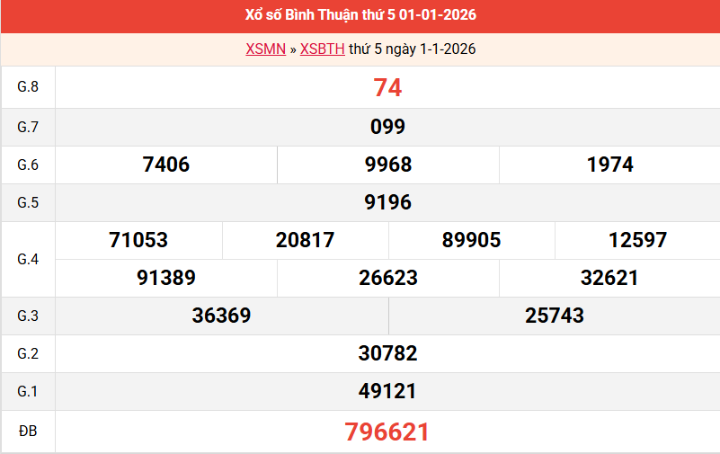 Bảng kết quả Bình Thuận ngày 01/01/2026 tuần trước