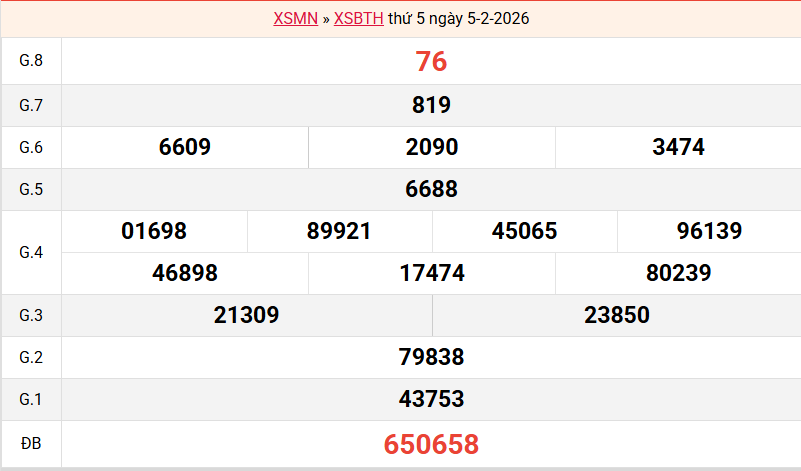 Mời các bạn xem lại bảng kết quả kỳ trước với giải đặc biệt, giải tám, lô tô 2 số để có thể đưa ra nhận định dự đoán BTH ngày 12/02/2026 chuẩn xác nhất.