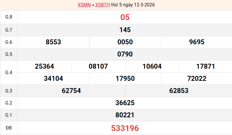 Mời các bạn xem lại bảng kết quả kỳ trước với giải đặc biệt, giải tám, lô tô 2 số để có thể đưa ra nhận định dự đoán BTH ngày 19/03/2026 chuẩn xác nhất.