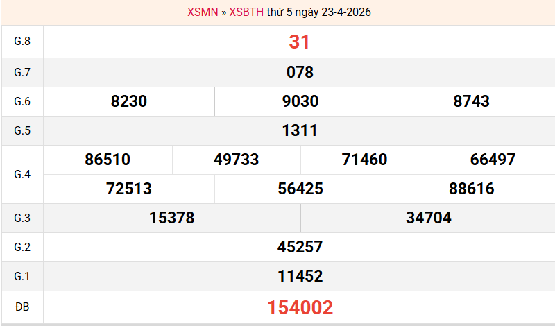 Mời các bạn xem lại bảng kết quả kỳ trước với giải đặc biệt, giải tám, lô tô 2 số để có thể đưa ra nhận định dự đoán BTH ngày 30/04/2026 chuẩn xác nhất.