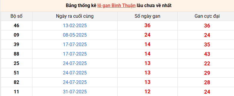 Bảng thống kê lô gan Bình Thuận lâu về nhất 30/10/2025