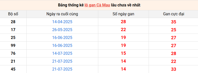 Bảng thống kê lô gan Cà Mau lâu về nhất 03/11/2025