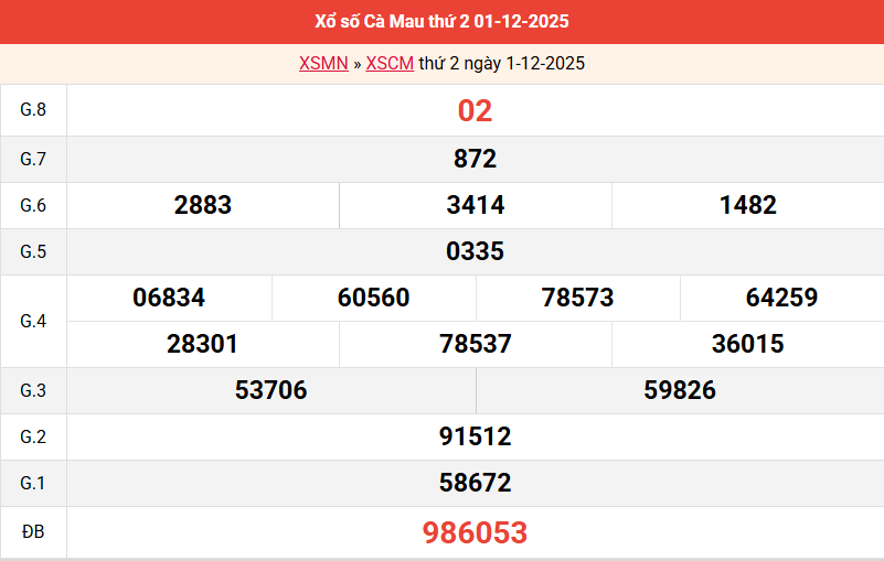 Bảng kết quả Cà Mau ngày 01/12/2025 tuần trước