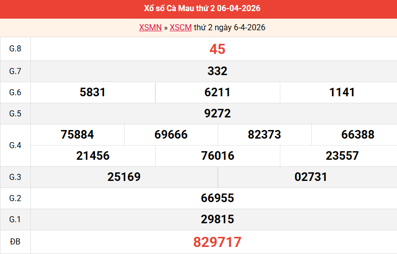Bảng kết quả Cà Mau ngày 06/04/2026 tuần trước